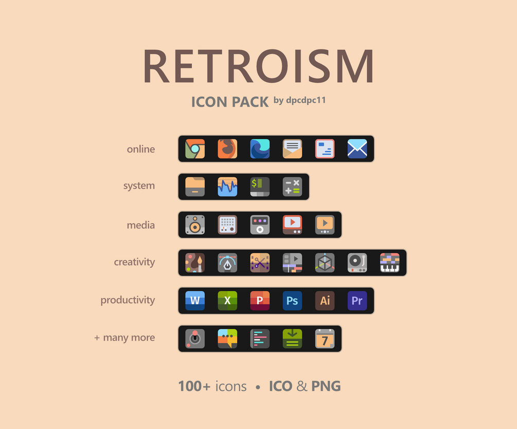 Check out this minimalist icon pack designed in a retro style that works perfectly on your Windows taskbar or Dock. As you can see from the preview, the main idea is to use generic icons for various app categories without using specific app logos or icons (with some exceptions like the Browsers, Adobe Suite, Affinity Apps and Microsoft Office). Instead, the icons illustrate the actual purpose of the app using familiar design elements. For example, if you're a content creator, you will find different creative icons for your video or music editing apps. The same goes for gaming, where you have a bunch of icons for your gaming platforms to choose from.